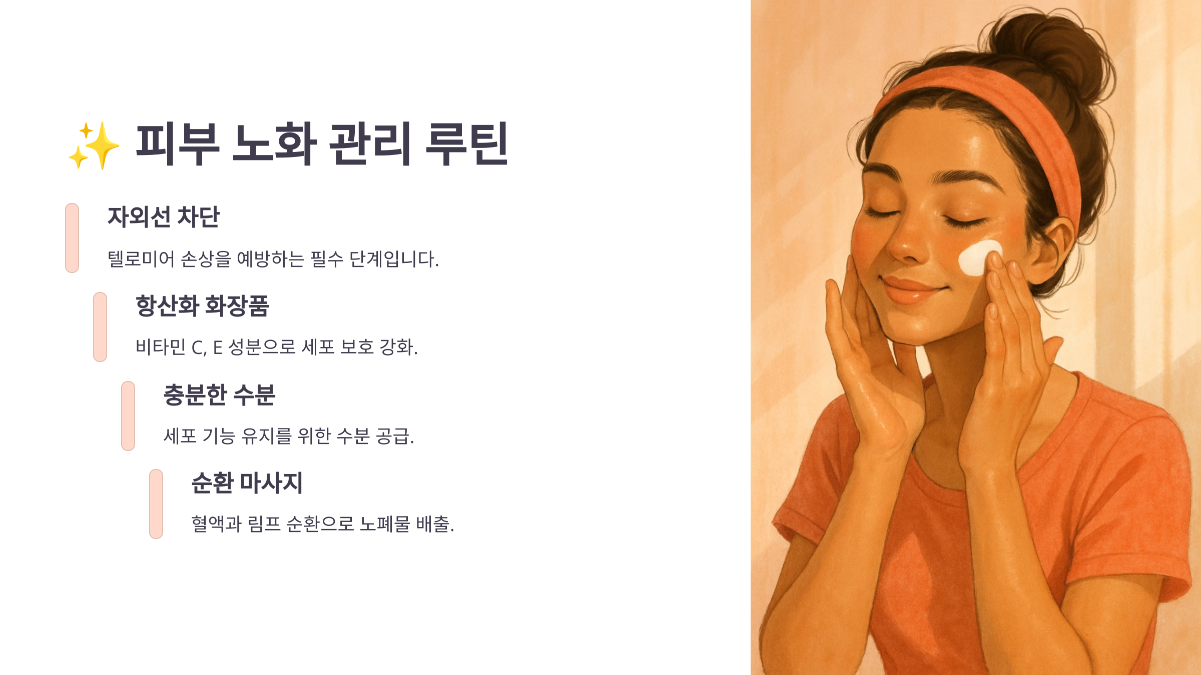 피부는 노화가 가장 먼저 드러나는 부위예요. 그래서 아침 루틴에 피부 케어를 포함시키는 게 정말 중요해요. 피부에 수분과 항산화 보호막을 제공하는 게 핵심이랍니다.
