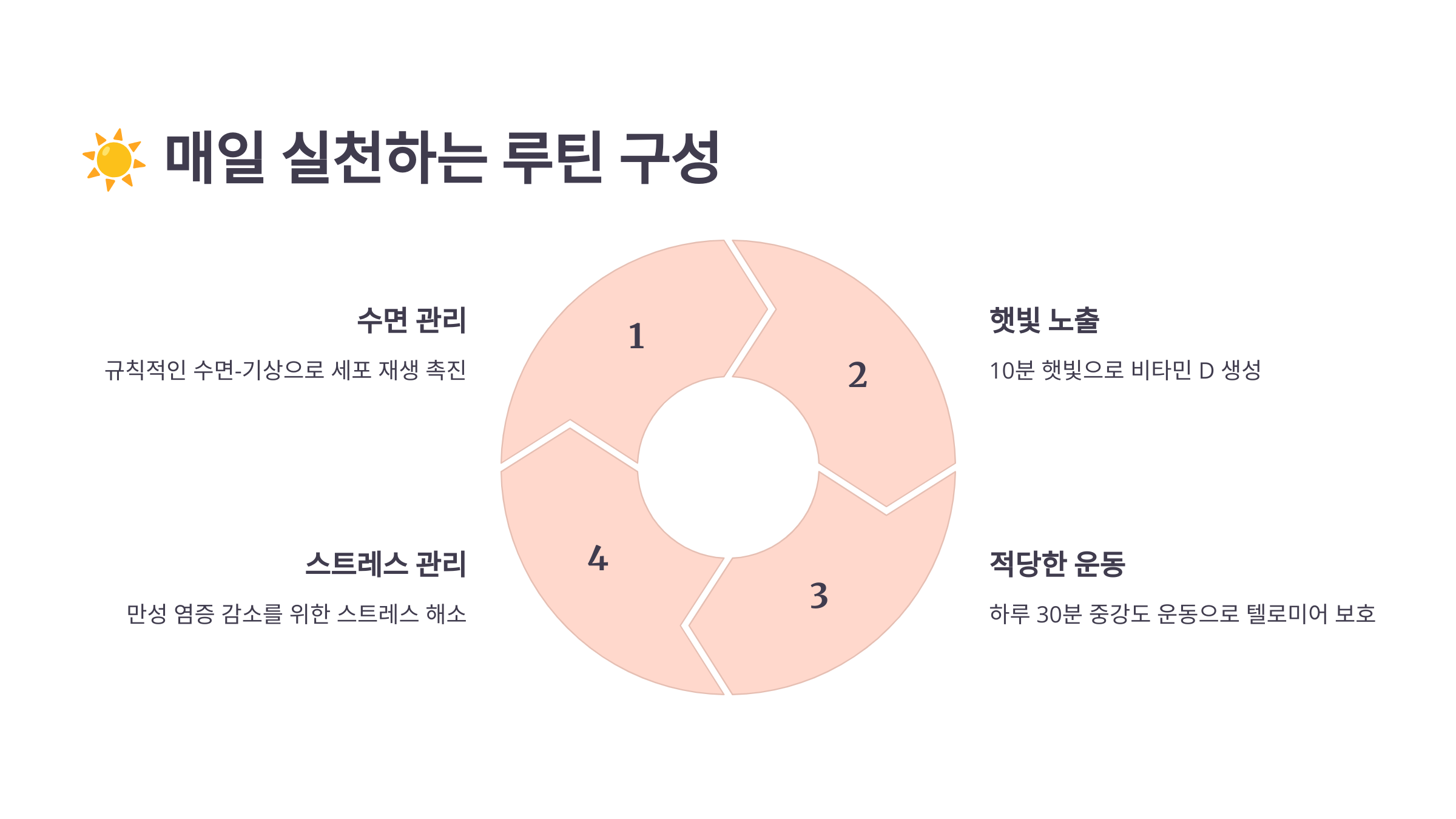 예를 들어, 아침 햇빛을 쬐는 것은 ‘서카디안 리듬’이라고 불리는 생체리듬을 조절하는 데 중요한 역할을 해요. 이 리듬이 흐트러지면 세포 회복과 면역 기능까지 저하될 수 있어요.