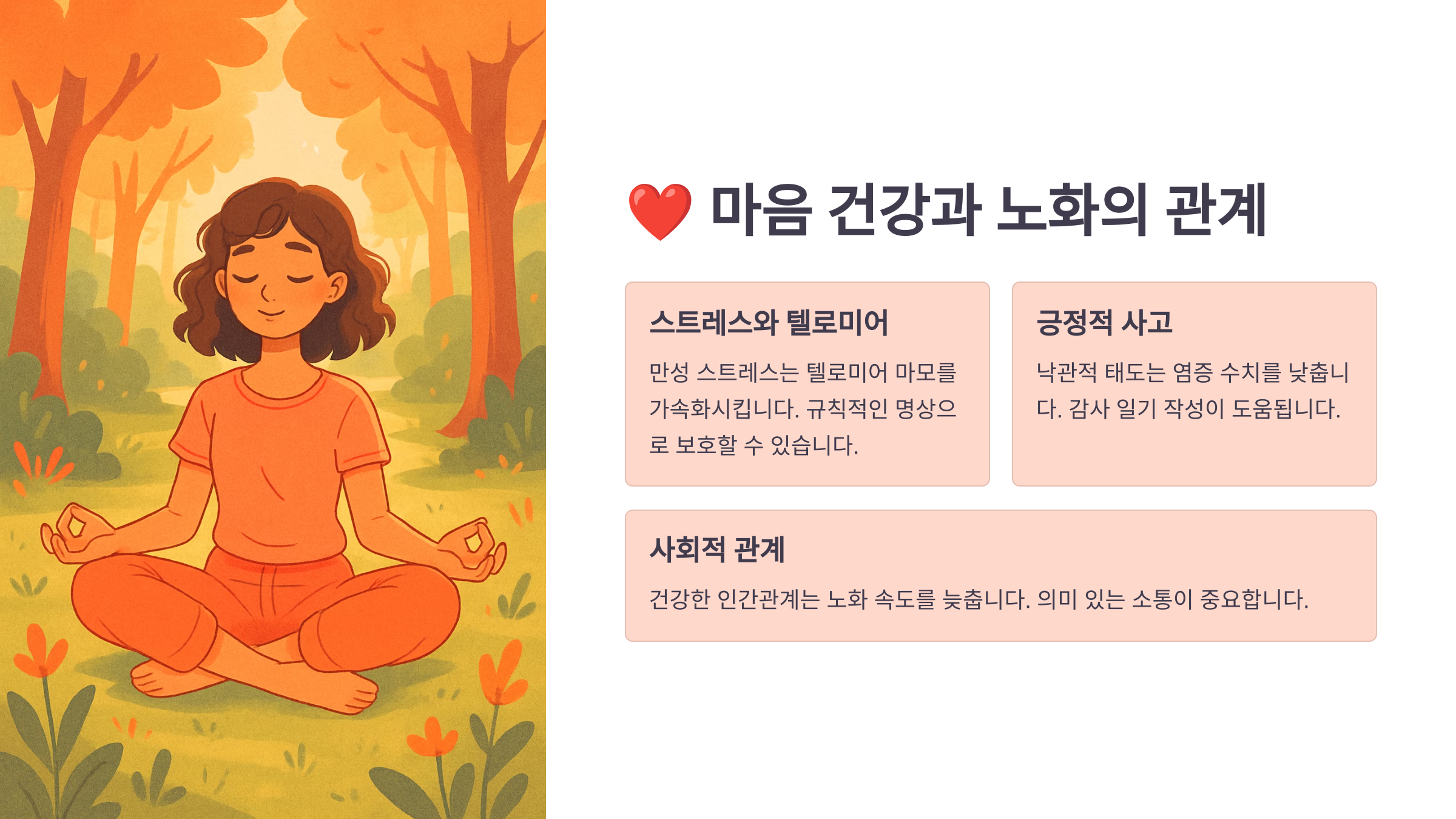 몸만 건강하면 되는 걸까요? 마음도 건강해야 진짜 젊음을 유지할 수 있어요. 심리적 스트레스는 노화의 가장 큰 적이에요. 눈에 보이지 않지만, 세포 하나하나에 영향을 주거든요.