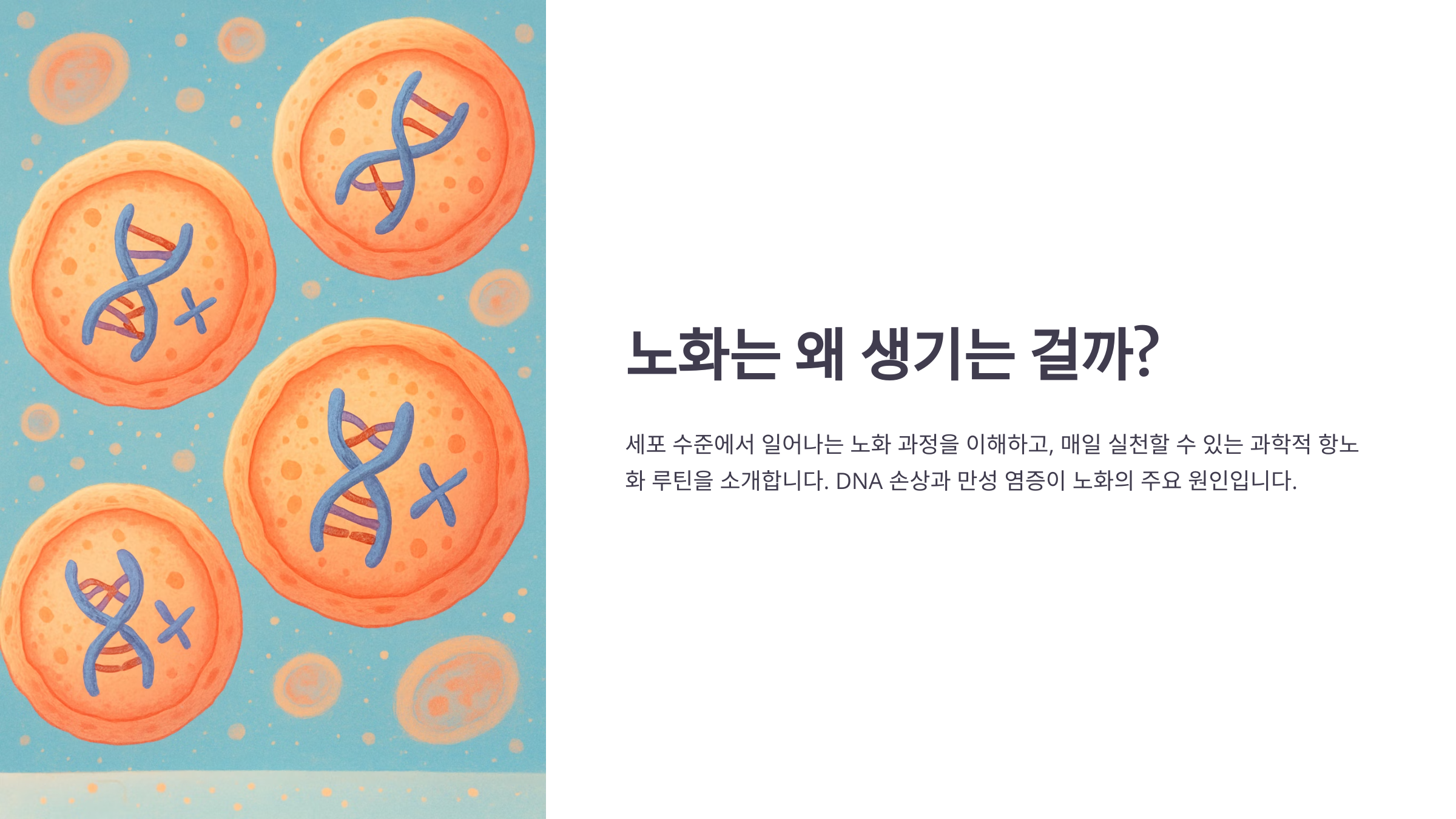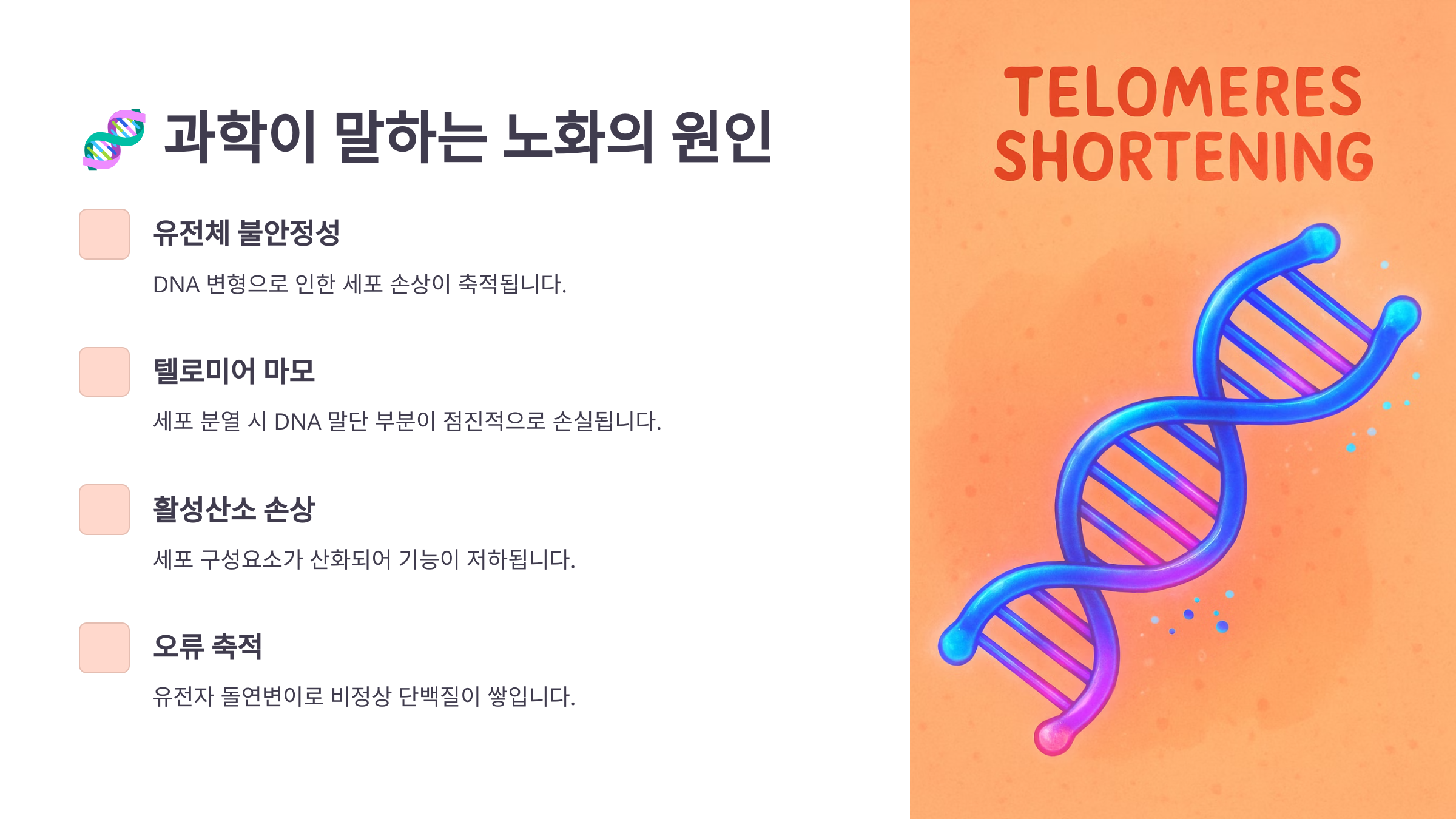 노화는 세포가 시간이 지나며 점차 기능을 잃어가는 자연스러운 과정이에요. 유전적인 요인도 있지만, 생활습관이나 환경적 요소가 노화 속도에 큰 영향을 줘요.