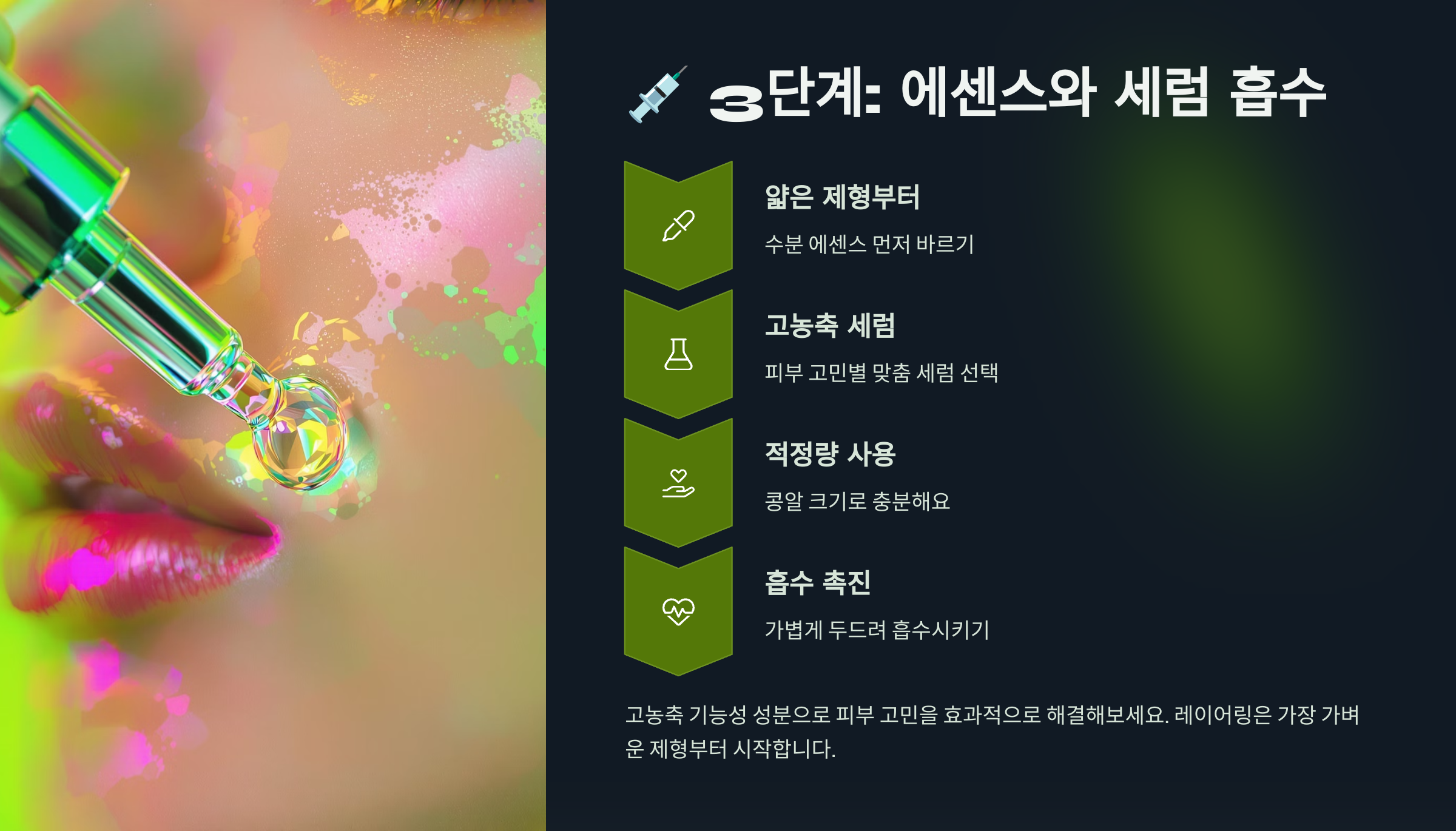 이 단계는 피부 고민에 따라 선택하는 게 중요해요. 미백, 주름, 탄력, 보습 등 목적에 따라 맞춤 세럼을 고르세요.